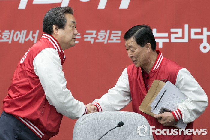 (서울=포커스뉴스) 김무성(왼쪽) 새누리당 대표가 29일 오전 서울 여의도 국회에서 열린 첫 중앙선거대책위원회의에 참석해, 황진하 사무총장과 악수하고 있다.