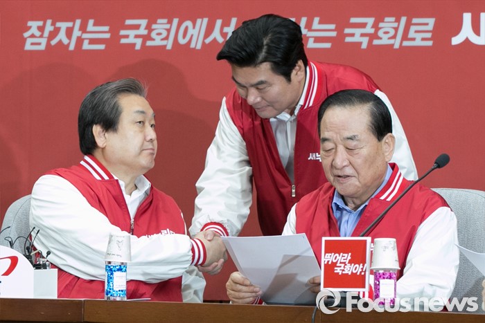 (서울=포커스뉴스) 김무성(왼쪽) 새누리당 대표와 원유철(가운데) 원내대표가 29일 오전 서울 여의도 국회에서 열린 첫 중앙선거대책위원회의에 참석해, 악수하는 동안, 서청원 최고위원이 문서를 보고 있다.