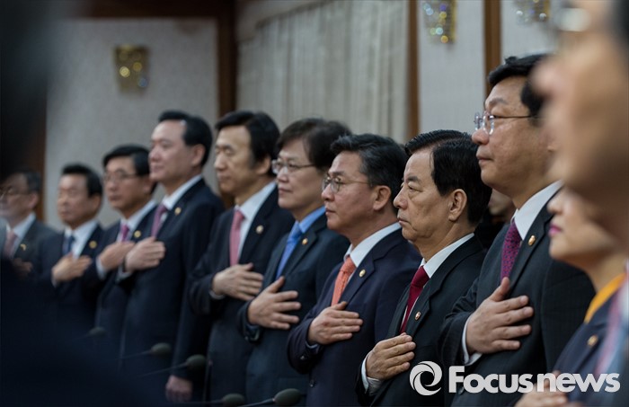 (서울=포커스뉴스) 29일 오전 서울 종로구 정부서울청사에서 열린 국무회의에 참석한 국무위원들이 국민의례를 하고 있다.