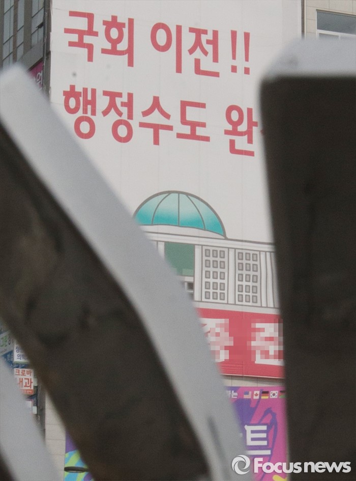 (세종=포커스뉴스) 29일 오전 세종시 국회의원 후보 선거사무소 외벽에 '국회이전, 행정수도 완성'이라는 공약이 적힌 현수막이 걸려있다.