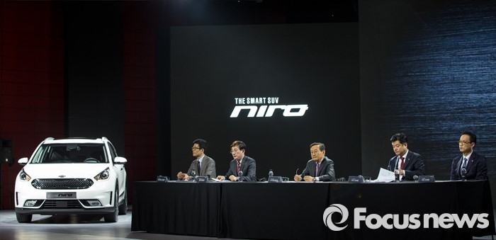 (서울=포커스뉴스) 29일 오전 서울 광진구 쉐라톤 그랜드 워커힐에서 기아차 친환경 소형 SUV '니로(NIRO)'가 공개된 뒤 기자간담회가 열리고 있다.