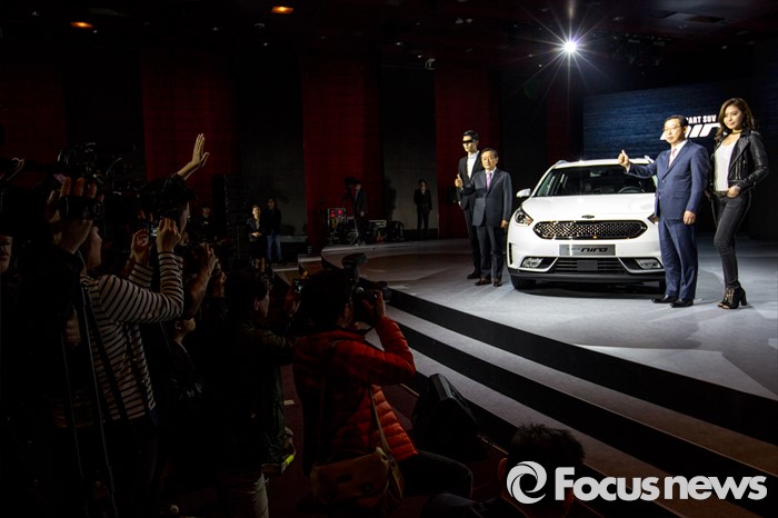 (서울=포커스뉴스) 박한우(오른쪽 두 번째) 기아자동차 사장과 김창식(왼쪽 두 번째) 부사장이 29일 오전 서울 광진구 쉐라톤 그랜드 워커힐에서 기아차 친환경 소형 SUV '니로(NIRO)'를 공개 하고 있다.