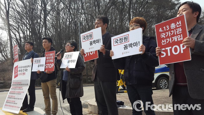 (서울=포커스뉴스) 총선시민네트워크 등 시민단체들이 29일 오전 국가정보원 정문 앞에서 기자회견을 열고 국정원의 불법 선거개입 재발 방지를 촉구했다.