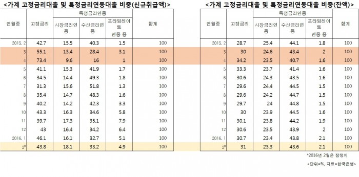 또 2015년 2월부터 고정금리 신규 대출자 비중 추이를 살펴보면 고정금리 비중이 변동금리 신규 대출 비중을 상회했던 적은 단 두 차례다. 작년 3월과 4월로 금융위가 고정금리 대출인 안심전환대출을 실시했던 때다. 당시 고정금리 신규 대출 비중은 각각 55.1%, 73.4%를 차지했다.