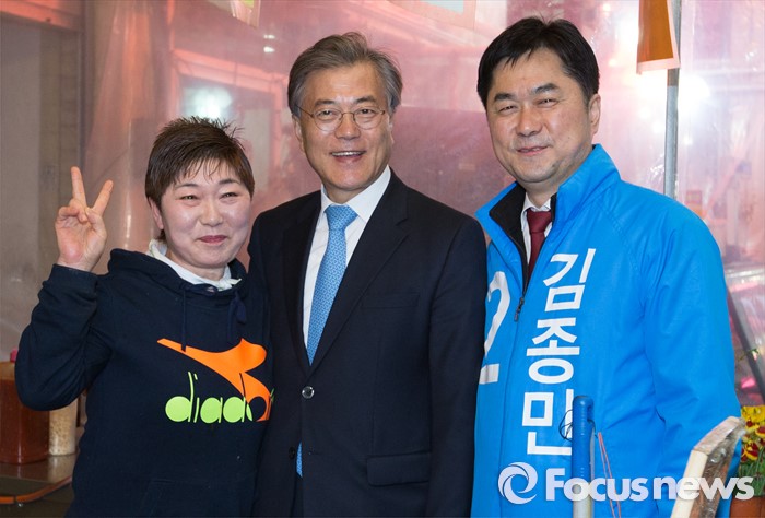(논산=포커스뉴스) 문재인 더불어민주당 전 대표가 29일 오후 충남 논산시 중앙시장을 방문해 김종민 후보의 지지를 호소하며 기념촬영하고 있다.