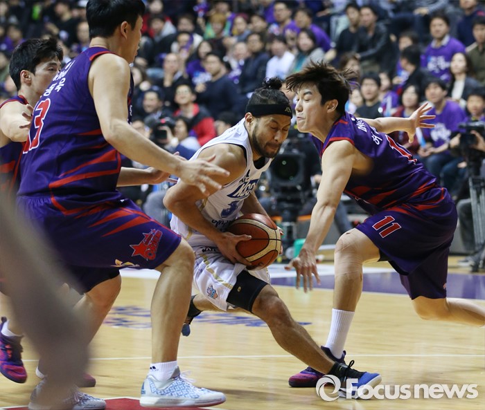 (고양=포커스뉴스) 29일 고양체육관에서 열린 2015-2016 프로농구 챔피언결정전 6차전 오리온-KCC 경기에서 KCC 전태풍이 오리온 김동욱과 허일영 사이로 돌파를 시도하고 있다.