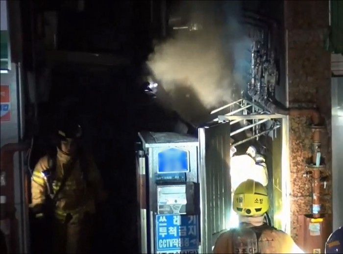 소방당국은 건물과 담장 사이에 쌓인 쓰레기 더미에서 불이 시작됐다고 보고 정확한 화재 원인을 조사 중이다.29일 오전 1시쯤 서울 노원구 상계동 다세대주택과 담장 사이에서 불이 나 출동한 소방관들이 불을 끄고 있다. (사진제공=서울 노원소방서)