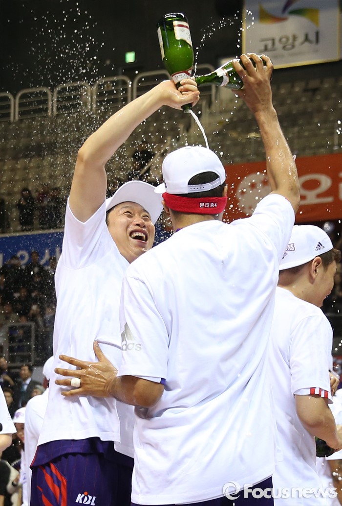 (고양=포커스뉴스) 29일 고양체육관에서 열린 2015-2016 프로농구 챔피언결정전에서 KCC를 4승2패로 물리치고 우승을 차지한 오리온 선수들이 샴페인을 뿌리며 환호하고 있다.