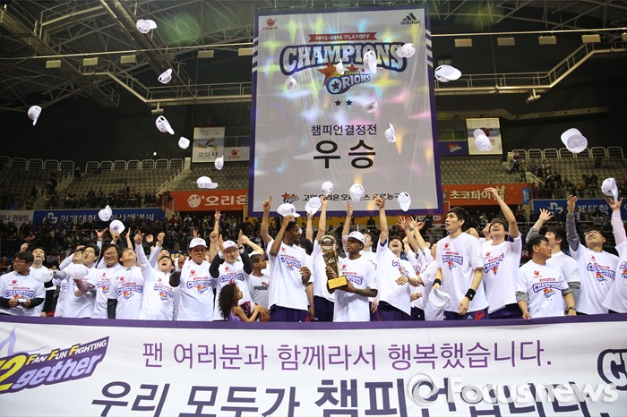 (고양=포커스뉴스) 29일 고양체육관에서 열린 2015-2016 프로농구 챔피언결정전에서 KCC를 4승2패로 물리치고 우승을 차지한 오리온 선수들이 챔피언 모자를 높이 던지며 환호하고 있다.