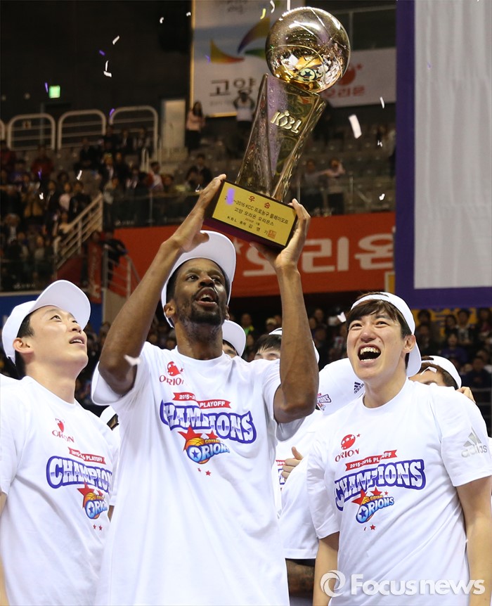 (고양=포커스뉴스) 29일 고양체육관에서 열린 2015-2016 프로농구 챔피언결정전 6차전에서 승리하며 4승 2패로 우승한 오리온 헤인즈가 우승 트로피를 들어 올리며 기쁨을 만끽하고 있다.
