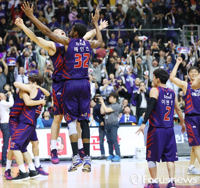 (고양=포커스뉴스) 29일 고양체육관에서 열린 2015-2016 프로농구 챔피언결정전 6차전을 승리하며 우승한 오리온 선수들이 경기 종료와 동시에 함께 뒤엉키며 환호하고 있다. 헤인즈와 김강선이 배치기를 하고 있다.