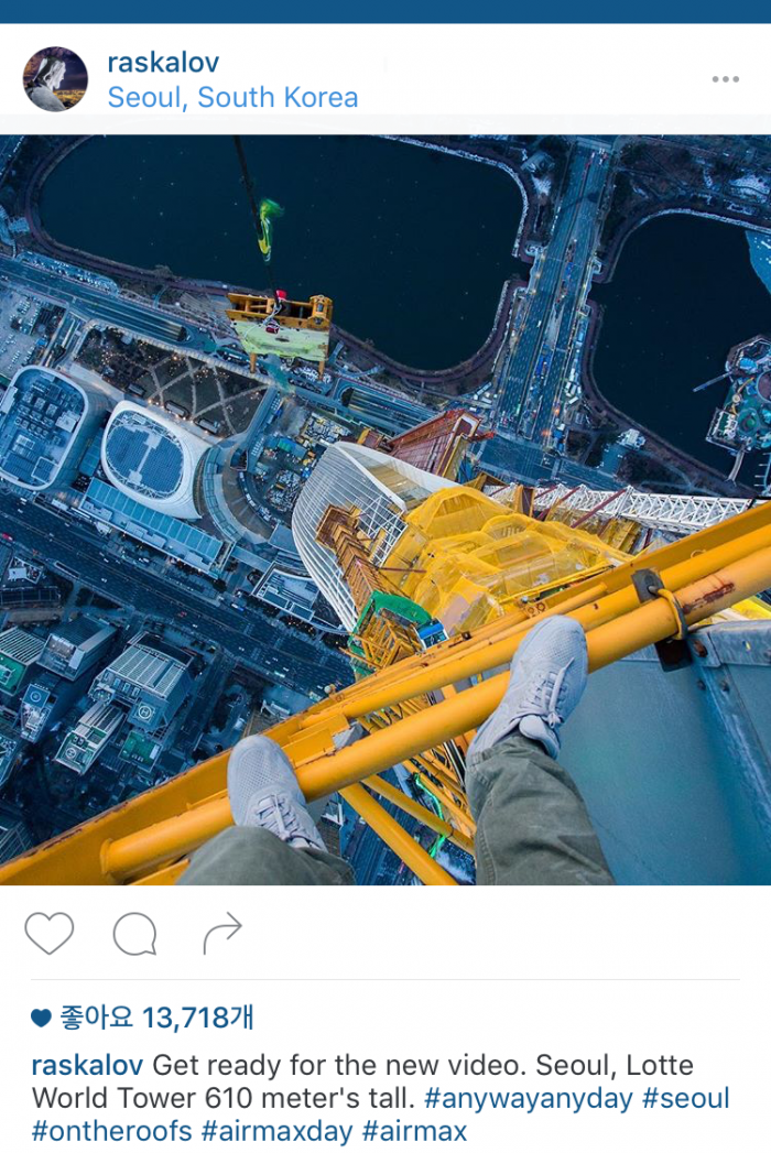 (서울=포커스뉴스) 러시아 출신 사진작가 비탈리 라스카로프가(22)가 27일 자신의 인스타그램을 통해 잠실 롯데월드타워 최상층에서 촬영한 사진을 공개했다. 또한 비탈리 라스카로프는 "곧 동영상을 공개하겠다"고 예고했다. 이 남성은 세계 유명 초고층 빌딩에 안전 장비 없이 맨몸으로 올라가 아찔한 사진을 올리기로 유명하다. <사진=비탈리 라스카로프 인스타그램 캡쳐>