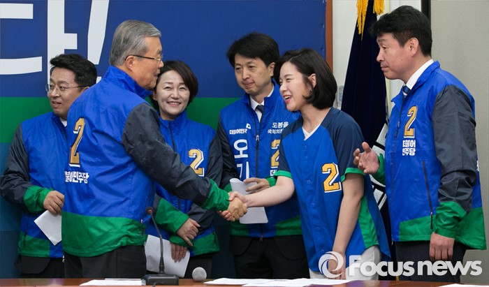 (서울=포커스뉴스) 김종인 더불어민주당 비대위 대표와 20대 총선 후보들이 30일 오전 서울 여의도 국회에서 더민주 후보들의 새정치 약속 발표를 마친 뒤 악수하고 있다.