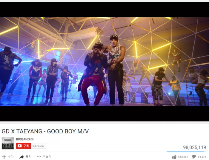 YG엔터테인먼트는 30일 “지디&태양의 ‘굿보이’ 뮤직비디오가 금일 오전 10시 기준 유튜브 조회수 9802만 5119뷰를 기록, 1억 뷰 돌파를 앞두고 있다”고 전했다.