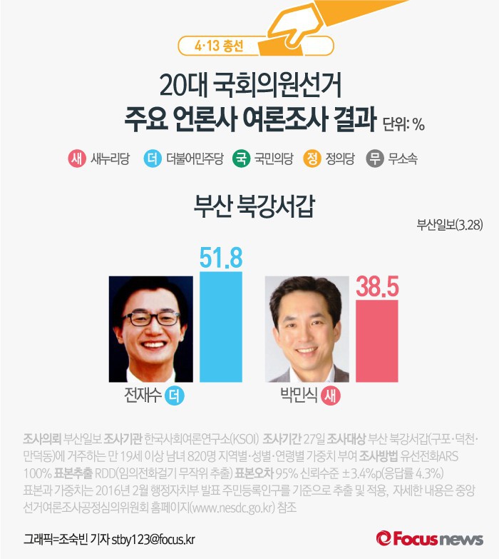 (서울=포커스뉴스) 부산일보가 한국사회여론연구소(KSOI)에 의뢰해 28일 발표한 여론조사 결과에 따르면 더불어민주당의 전재수 후보는 51.8%, 새누리당 박민식 후보는 38.5%의 지지율을 기록한 것으로 나타났다.