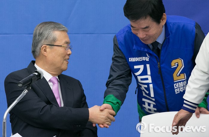 (수원=포커스뉴스) 30일 오전 수원 팔달구 경기도의회에서 열린 더불어민주당 경제살리기 경기 국회의원 후보자 연석회의에 참석한 김종인(왼쪽) 비대위 대표 겸 선대위원장과 김진표 부위원장이 인사하고 있다.