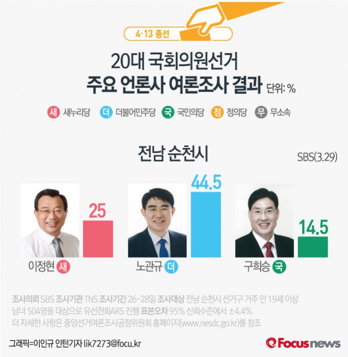 (서울=포커스뉴스) SBS가 TNS에 의뢰해 29일 발표한 여론조사 결과에 따르면 더민주 노관규 후보가 44.5%, 이정현 후보가 25.0%, 국민의당 구희승 후보가 14.5%를 기록했다. 지지율 2위와 3위 후보를 합친 지지율 보다 5.0%p 높다.