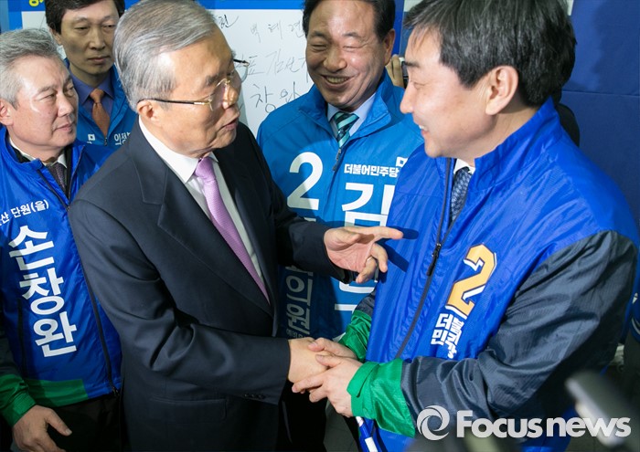 (수원=포커스뉴스) 30일 오전 수원 팔달구 경기도의회에서 더불어민주당 경제살리기 경기 국회의원 후보자 연석회의를 마친 뒤 김종인(왼쪽) 비대위 대표와 이종걸 원내대표가 대화하고 있다.