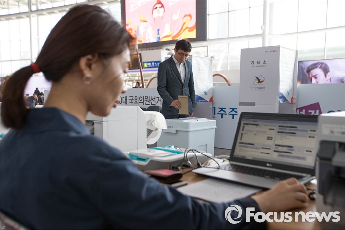 (서울=포커스뉴스) 제20대 국회의원선거를 14일 앞둔 30일 오후 서울 중구 서울역에 마련된 사전투표 모의체험장에서 시민들이 다음달 8일, 9일 실시되는 사전투표를 미리 체험할 수 있는 모의체험을 하고 있다.