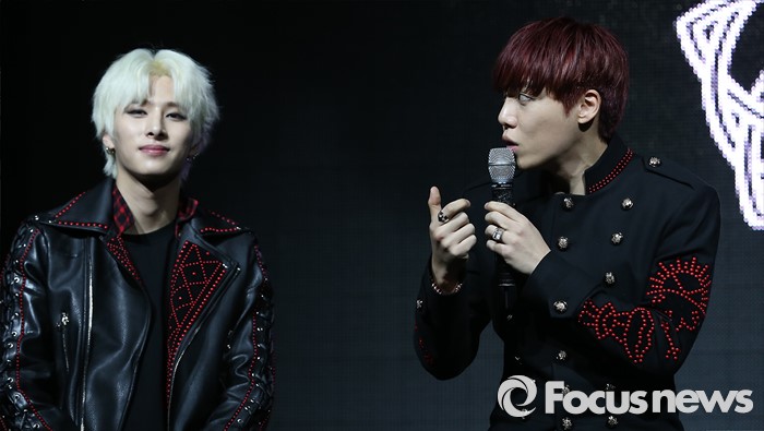 (서울=포커스뉴스) 30일 오후 서울 마포구 예스24 무브홀에서 열린 아이돌그룹 소년공화국의 세번째 미니앨범 [BR: evolution] 발표 쇼케이스에 참석한 멤버 원준이 취재진의 질문에 답하고 있다. 왼쪽부터 민수, 원준.