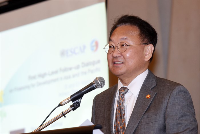 (인천=포서스뉴스) 유일호 부총리 겸 기획재정부장관이 30일 인천 송도 쉐라톤호텔에서 열린 '제1회 아태지역 개발재원 고위 후속대화'에 참석해 '지속가능개발목표(SDGs) 달성 및 개발재원 확대를 위한 한국의 아태지역 지원 방향'을 주제로 특별강연을 하고 있다. <사진제공=기획재정부>
