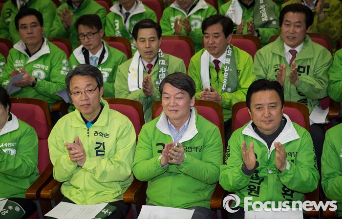 (서울=포커스뉴스) 안철수 국민의당 상임공동대표와 김영환 공동선거대책위원장, 김성식 최고위원이 30일 오후 서울 여의도 국회에서 열린 총선 승리를 위한 국민의당 수도권 후보 출정식에서 박수를 치고 있다.