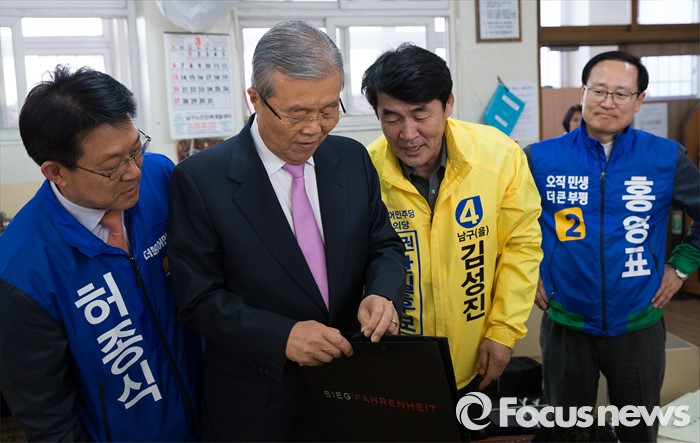 (서울=포커스뉴스) 김종인 더불어민주당 비대위 대표가 30일 오후 인천 남구 노인인력센터를 방문해 직접 종이봉투 끈을 묶고 있다. 왼쪽부터 허종식 인천 남구갑 후보, 김 대표, 김성진 정의당 인천 남구을 야권 단일후보, 홍영표 더민주 인천 부평을 후보.