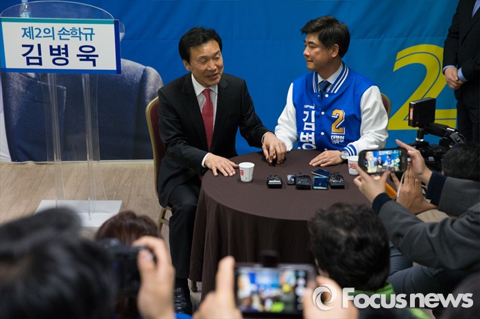 (성남=포커스뉴스) 손학규 전 더불어민주당 상임고문이 30일 오후 경기도 성남시 김병욱 더민주당 분당을 후보 선거사무소을 방문해 김후보와 이야기를 나누고 있다.