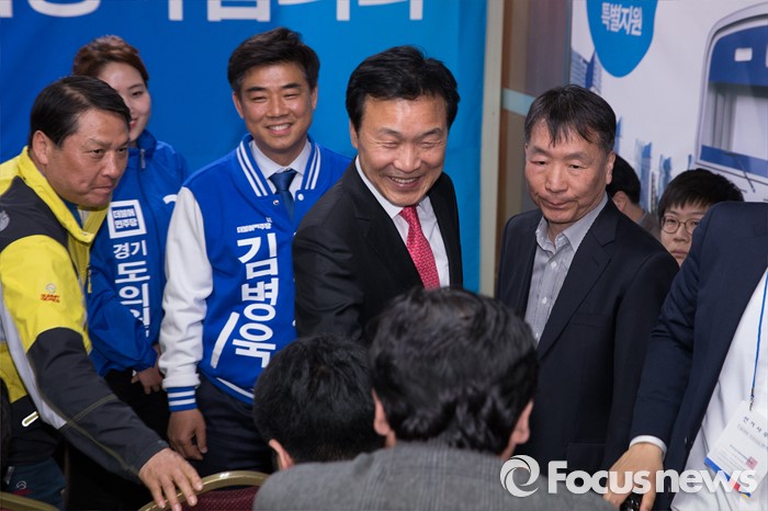 (성남=포커스뉴스) 손학규 전 더불어민주당 상임고문이 30일 오후 경기도 성남시 김병욱 더민주당 분당을 후보 선거사무소을 방문해 지지자들과 악수하고 있다.