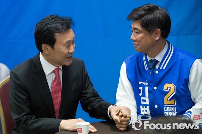 (성남=포커스뉴스) 손학규 전 더불어민주당 상임고문이 30일 오후 경기도 성남시 김병욱 더민주당 분당을 후보 선거사무소을 방문해 김후보와 이야기를 나누고 있다.