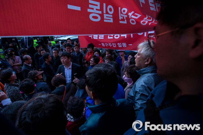 (대구=포커스뉴스) 30일 오후 대구 수성구 새누리당 대구시당 앞에서 이재만 새누리당 대구 동구을 예비후보 지지자들이 '선거대책위원회의'에 참석하기 위해 대구를 방문한 김무성 새누리당 대표에게 항의하기 위해 모여 있다.