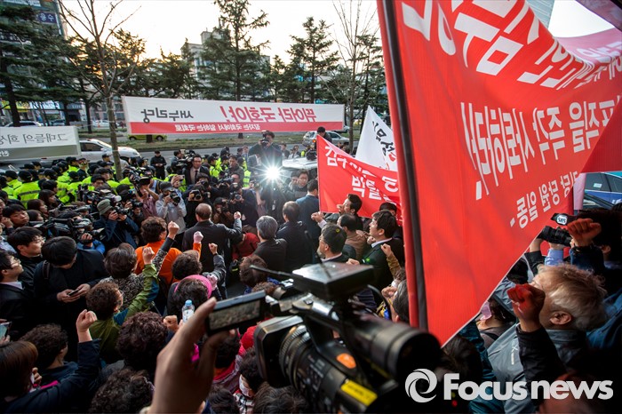 (대구=포커스뉴스) 30일 오후 대구 수성구 새누리당 대구시당 앞에서 이재만 새누리당 대구 동구을 예비후보 지지자들이 '선거대책위원회의'에 참석하기 위해 대구를 방문한 김무성 새누리당 대표에게 항의하기 위해 모여 있다.