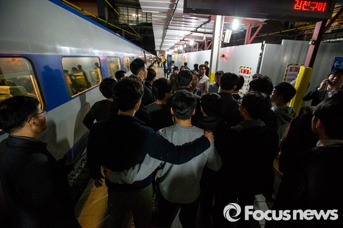 (대구=포커스뉴스) 김무성 새누리당 대표가 30일 오후 동대구역에서 서울로가는 열차를 탑승하자 경호원들이 이재만 새누리당 동구을 예비후보 지지자들이 접근하지 못하도록 막고 있다.