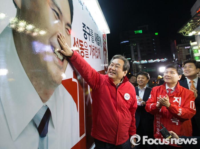 (서울=포커스뉴스) 4.13총선 공식선거운동 첫날인 31일 오전 서울 중구 동대문 누죤 앞에서 김무성 새누리당 공동선대위원장이 지상욱 서울 중구성동구을 후보 선거유세차량을 만지고 있다.