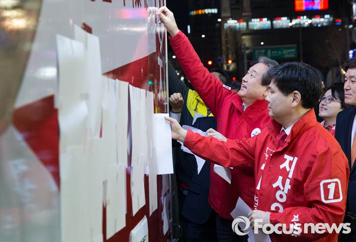 (서울=포커스뉴스) 4.13총선 공식선거운동 첫날인 31일 오전 서울 중구 동대문 누죤 앞에서 김무성 새누리당 공동선대위원장이 지상욱 서울 중구성동구을 후보와 선거유세차량 가림막을 제거하고 있다.