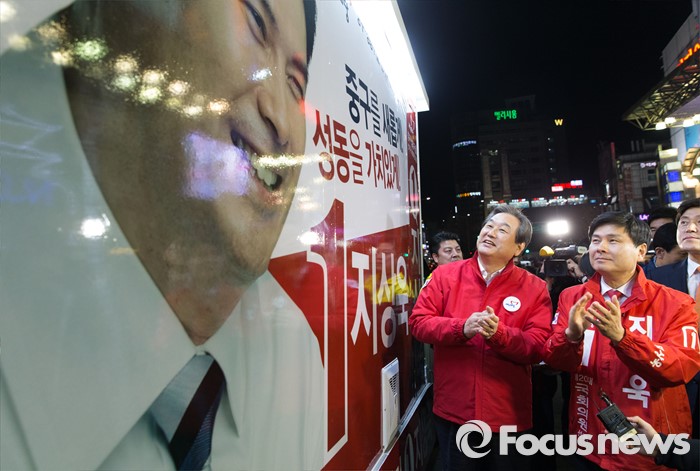 (서울=포커스뉴스) 4.13총선 공식선거운동 첫날인 31일 오전 서울 중구 동대문 누죤 앞에서 김무성 새누리당 공동선대위원장이 지상욱 서울 중구성동구을 후보와 선거유세차량 가림막 제거 후 박수를 치고 있다.