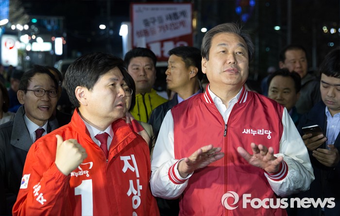 (서울=포커스뉴스) 4.13총선 공식선거운동 첫날인 31일 오전 서울 중구 동대문 누죤 앞에서 김무성 새누리당 공동선대위원장이 지상욱 서울 중구성동구을 후보와 선거유세에 앞서 취재진 질문에 답하고 있다.