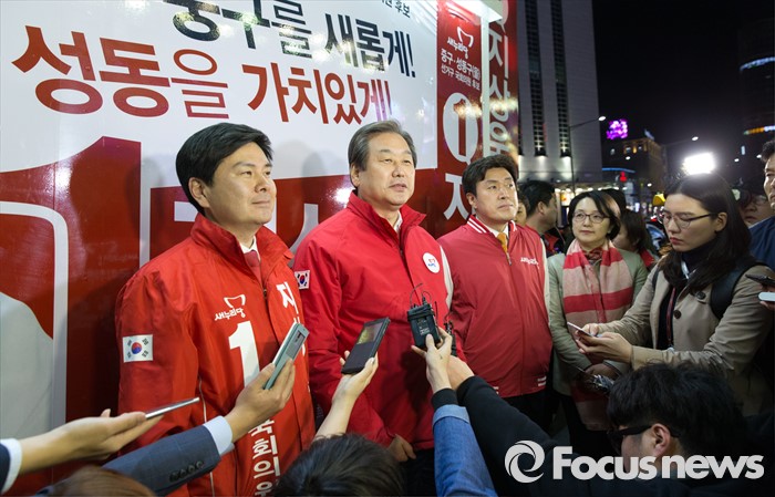 (서울=포커스뉴스) 4.13총선 공식선거운동 첫날인 31일 오전 서울 중구 동대문 누죤 앞에서 김무성 새누리당 공동선대위원장이 지상욱 서울 중구성동구을 후보와 선거운동에 앞서 취재진 질문에 답하고 있다.