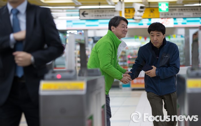 (서울=포커스뉴스) 총선 선거운동이 공식적으로 시작된 31일 오전 안철수 국민의당 노원병 후보가 서울 노원구 수락산역 역사 내에서 지역 주민들에게 출근 인사를 하고 있다.