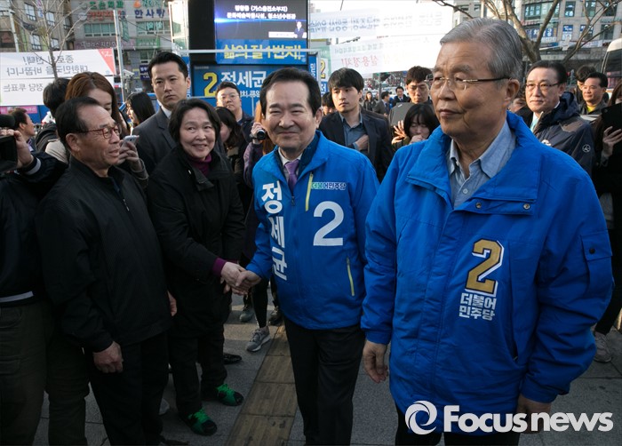 (서울=포커스뉴스) 20대 총선 공식선거 운동이 시작된 31일 오전 서울 동묘앞역 인근 거리에서 김종인(오른쪽) 더불어민주당 비대위 대표 겸 선대위원장과 정세균 서울 종로구 후보가 시민들에게 지지를 호소하고 있다.