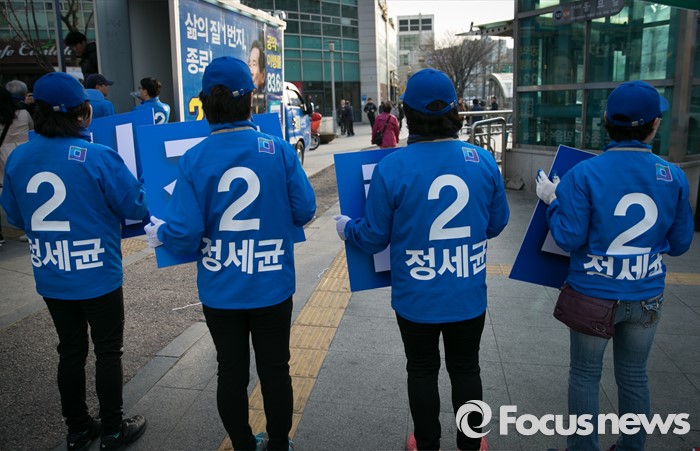 (서울=포커스뉴스) 20대 총선 공식선거 운동이 시작된 31일 오전 서울 동묘앞역 인근 거리에서 정세균 더불어민주당 서울 종로구 후보의 선거운동원들이 지지를 호소하고 있다.