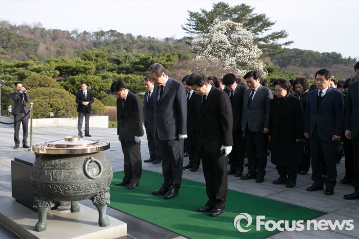 (서울=포커스뉴스) 4.13 총선 공식선거운동이 시작된 31일 오전 서울 동작구 국립현충원에서 김무성 새누리당 대표를 비롯한 지도부와 후보들이 묵념을 하고 있다.