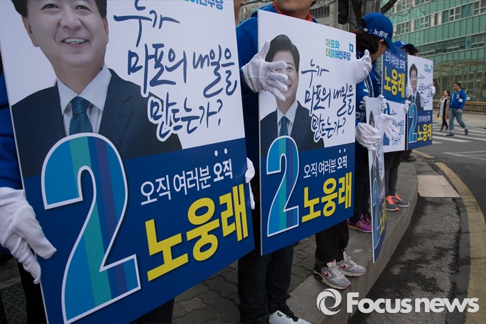 (서울=포커스뉴스) 20대 총선 공식선거 운동이 시작된 31일 오전 서울 마포구 공덕오거리에서 노웅래 더불어민주당 마포갑 후보측이 출근길 선거유세를 하고 있다.
