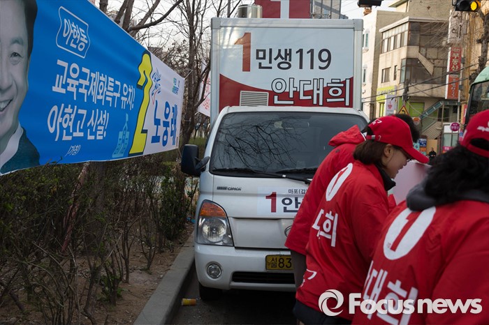 (서울=포커스뉴스) 20대 총선 공식선거 운동이 시작된 31일 오전 서울 마포구의 한 아파트 입구에서 안대희 새누리당 마포구갑 후보측이 출근길 선거유세를 하고 있다.