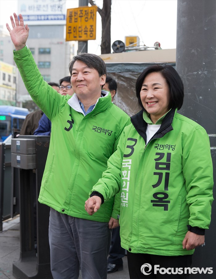 (서울=포커스뉴스) 총선 선거운동이 공식적으로 시작된 31일 오전 안철수 국민의당 상임공동대표(왼쪽)가 서울 강북구 수유동에서 김기옥 강북갑 후보 지원 유세를 하고 있다.