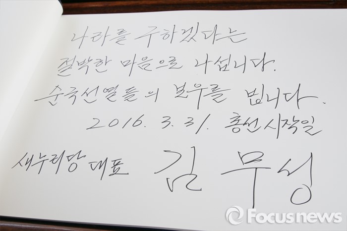 김무성 대표는 첫 공식 선거운동일인 이날 오전 8시 서울 동작구 동작동 국립현충원을 찾아 참배한 뒤 방명록에 이같이 작성했다.