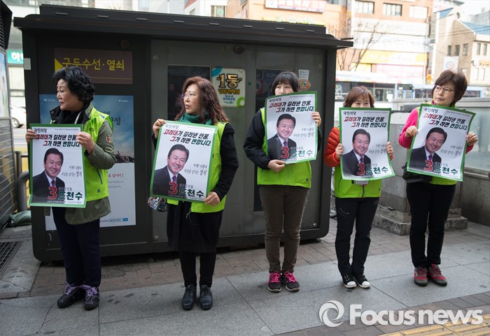 (서울=포커스뉴스) 총선 선거운동이 공식적으로 시작된 31일 오전 서울 성북구 성신여대입구역 앞에서 선거운동 자원 봉사자들이 도천수 성북갑 후보 포스터를 들고 있다.