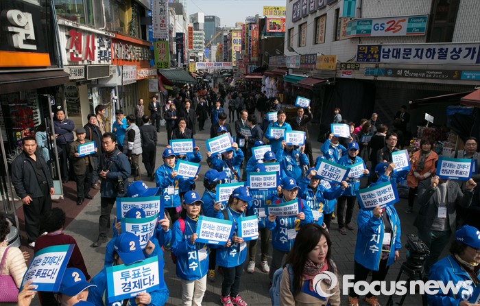 (서울=포커스뉴스) 20대 총선 공식선거 운동이 시작된 31일 오전 서울 남대문시장에서 열린 더불어민주당 중앙선거대책위원회 출정식에 참석한 선거운동원들이 피켓을 들고 지지를 호소하고 있다.