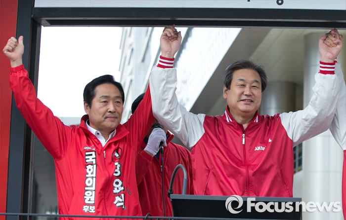 (서울=포커스뉴스) 4.13 총선 공식선거운동이 시작된 31일 오전 서울 구로구 구로디지털단지역 인근 한 대형마트 앞에서 김무성(오른쪽) 새누리당 대표가 강요식(왼쪽) 구로을 후보 지원유세 참석해, 손을 들고 있다.