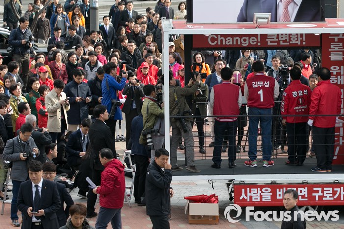 (서울=포커스뉴스) 4.13 총선 공식선거운동이 시작된 31일 오전 서울 구로구 구로디지털단지역 인근 한 대형마트 앞에서 김무성 새누리당 대표가 강요식 구로을 후보 지원유세를 하는 동안, 시민들이 지켜보고 있다.